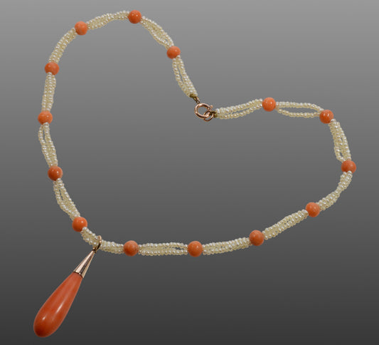 Antique Victorian Seed Pearl Coral Choker Necklace 9K Gold C.1880