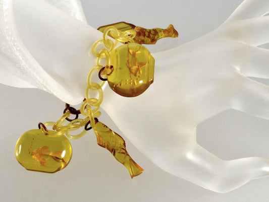 Vtg Rare Apple Juice Bakelite Reverse Carved Fishbowl Charm Bracelet C.1930