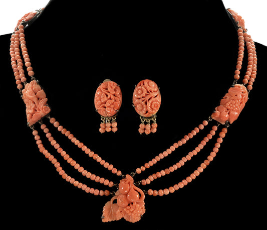 Antique Art Deco Chinese Carved Salmon Coral Necklace Earrings Set