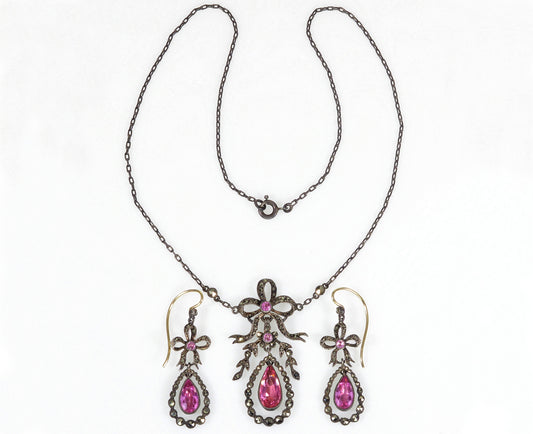 Reserved for D.T. Antique Georgian Bow Earrings Necklace Set Paste Marcasite Sterling C.1820