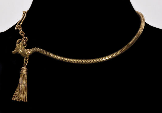 Early Victorian Pinchbeck Snake Chain Figurine 12K Tassel Necklace C.1830