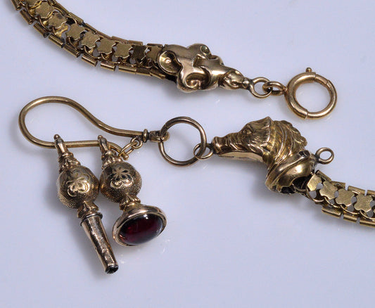 Antique Georgian 14K Gold Boar Head Fobs Snake Watch Chain Necklace C.1820