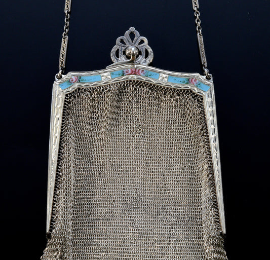 Antique Art Deco Whiting & Davis Sterling Mesh Purse Handbag Enamel Sapphire C.1920