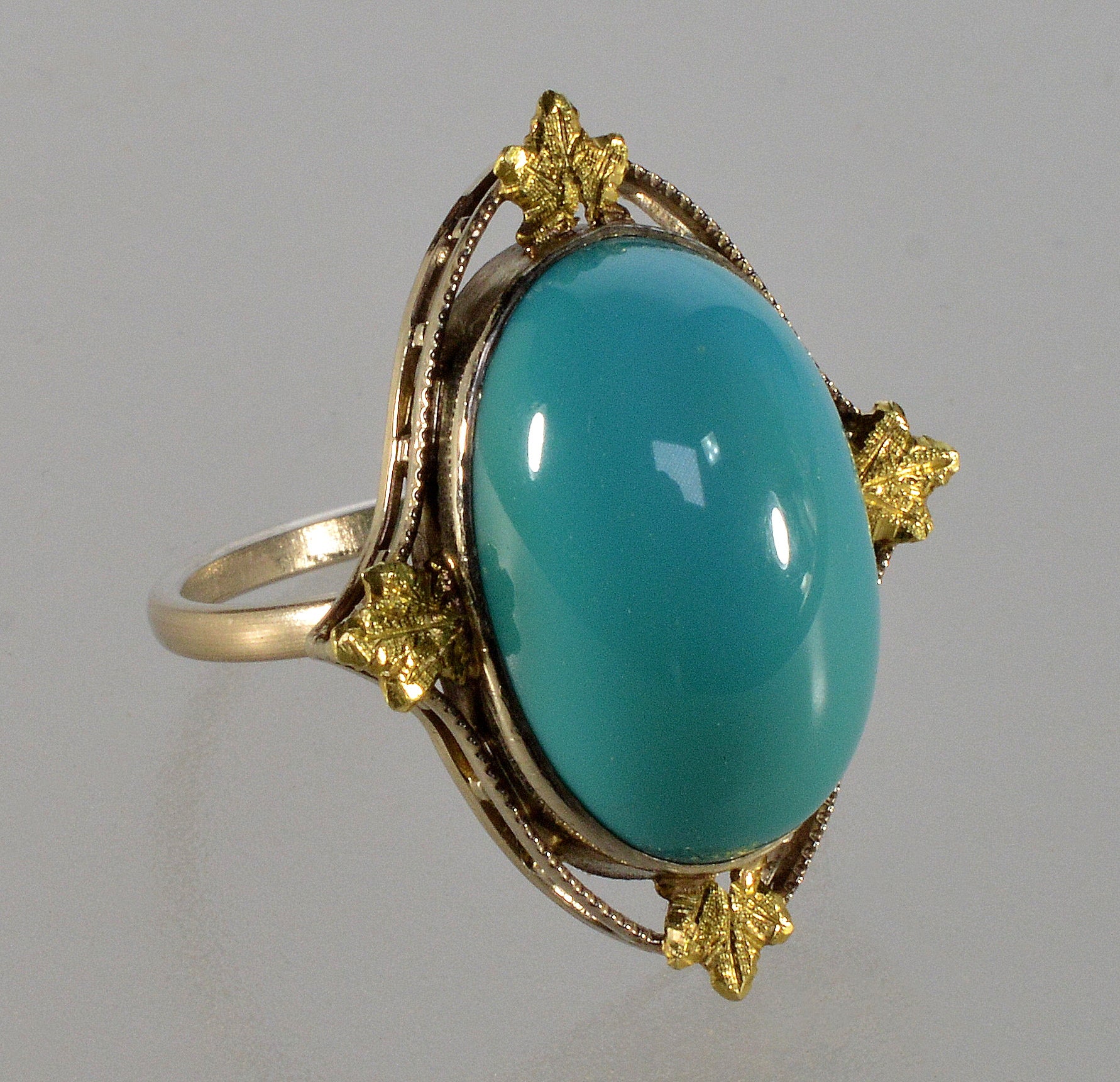 natural turquoise oval cabochon set in 2-tone 14K gold.