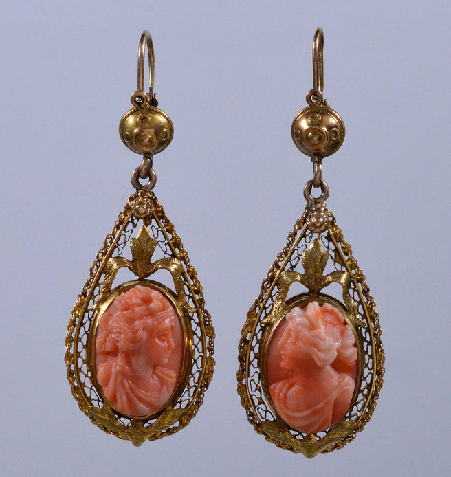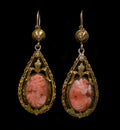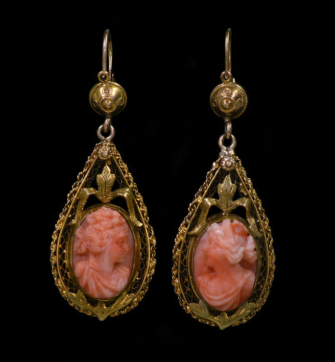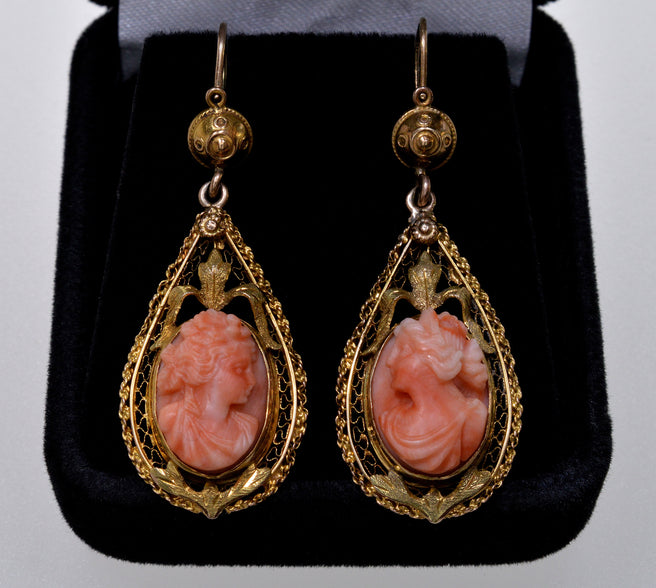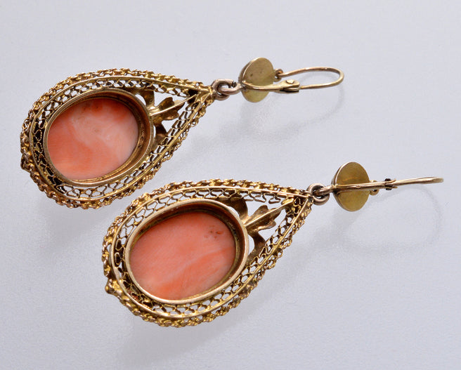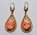 Antique Victorian 14K Gold Coral Cameo Earrings C.1840