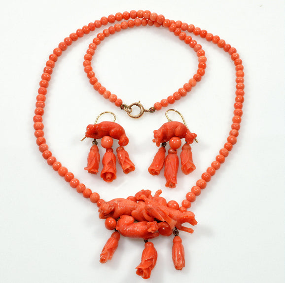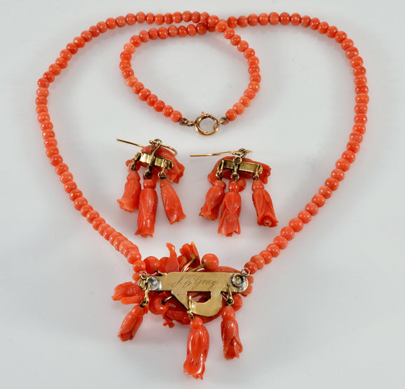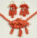 Antique Victorian Salmon Coral 14K Gold Necklace Earrings Set C.1860