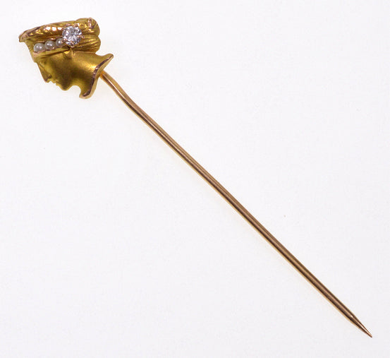 Neoclassical 10K gold diamond pearl stick pin C.1900.