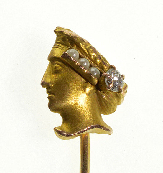 Art Nouveau Neoclassical 10K Diamond Pearl Stick Pin C.1900