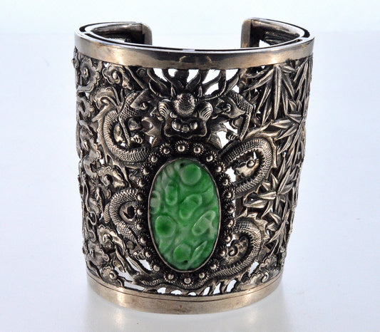 Antique Chinese Dragon Jade Sterling Cuff Bracelet C.1890
