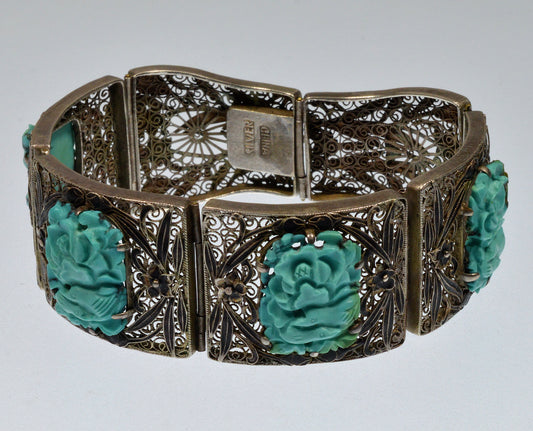Antique Chinese Carved Turquoise Enamel Silver Bracelet C.1890