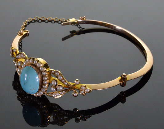 Reserved for S. Antique Edwardian 15K Gold Turquoise Pearl Bangle Bracelet C.1900