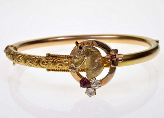 Victorian Horse Head 14K Gold Bangle Bracelet Diamond Ruby Size 6 1/2" C.1890