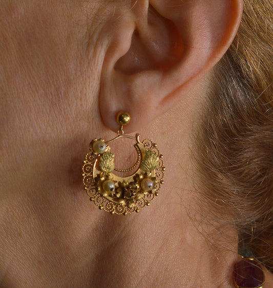 Antique Victorian Etruscan Revival 14K Gold Earrings Pearls Flowers C.1860