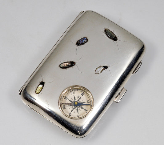 Antique Japan Shibayama Insect Inlay Cigarette Case With Compass Sterling C.1915