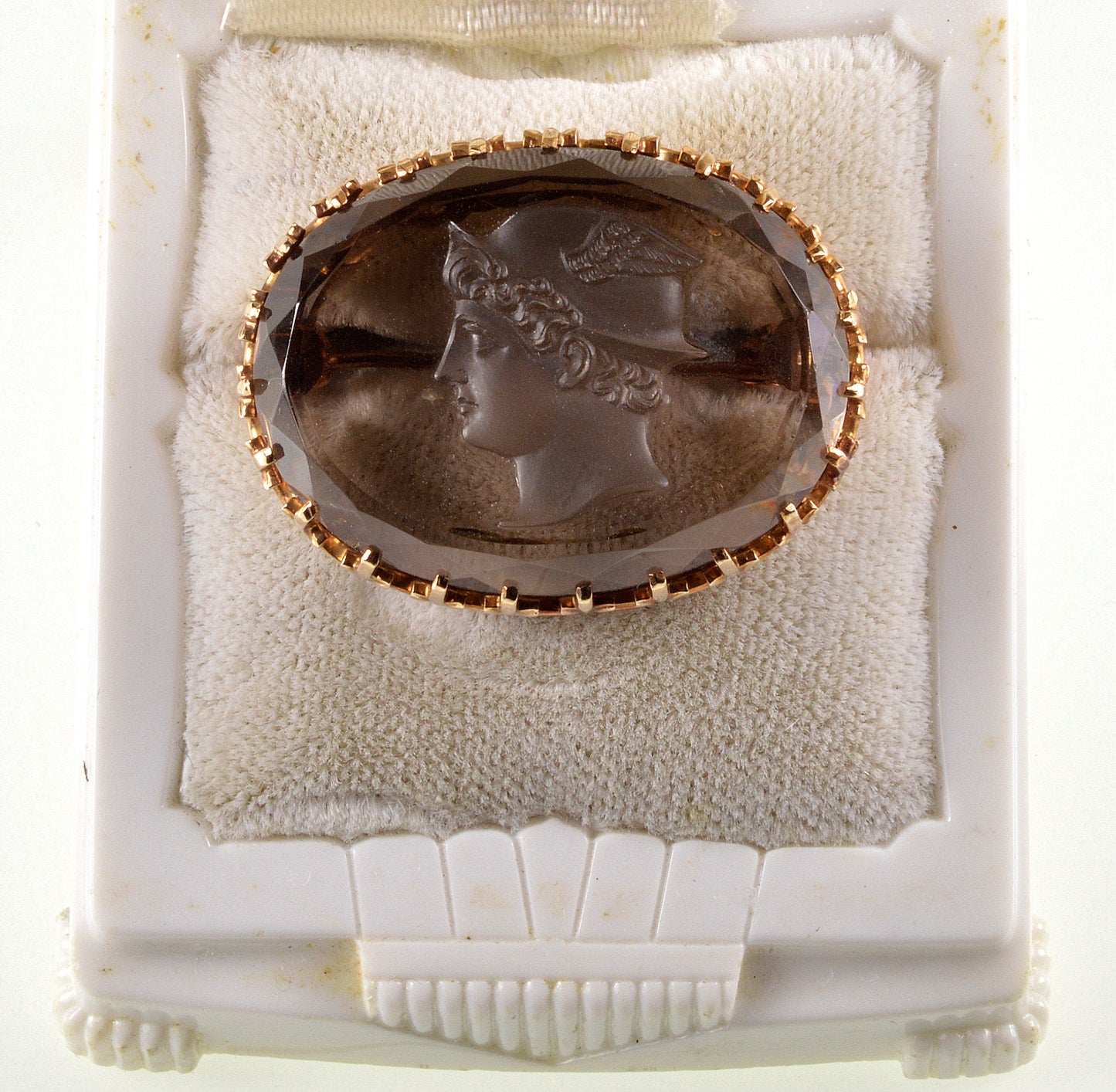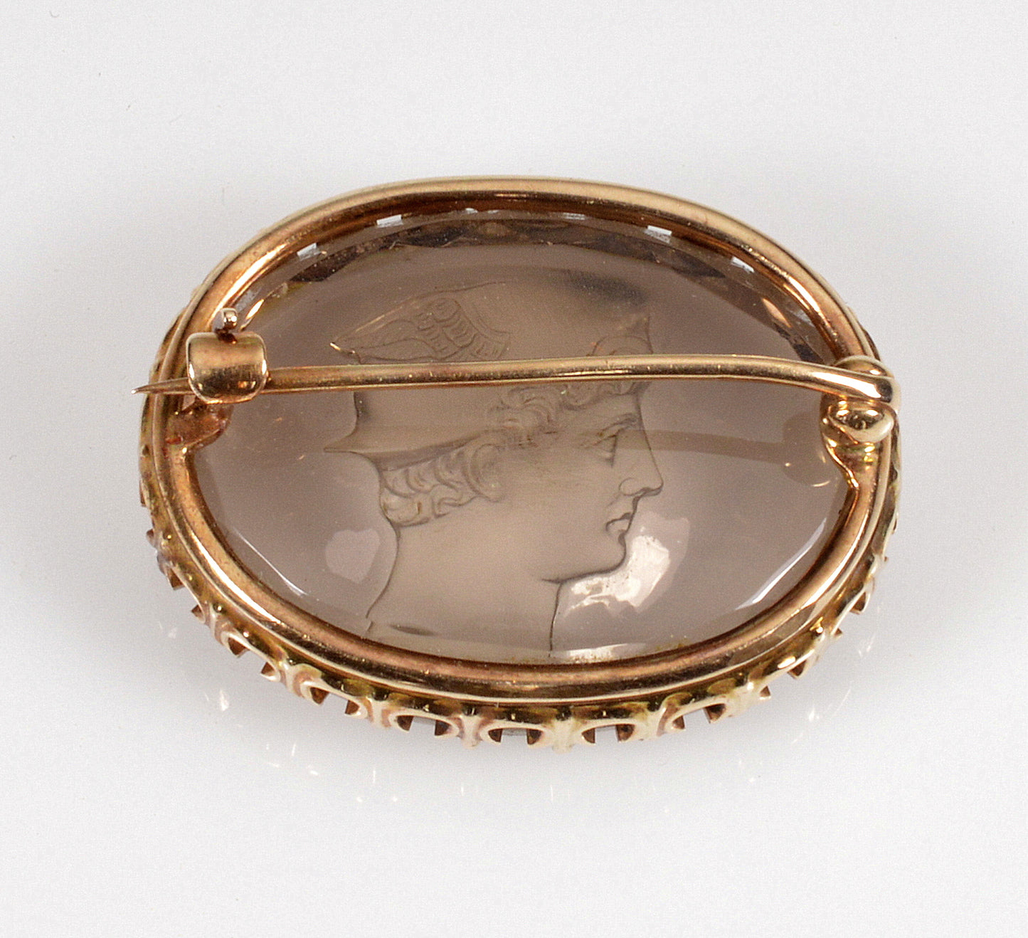 Antique Edwardian 10K Gold Hermes Cameo Brooch Pin Carved Smoky Quartz C.1900