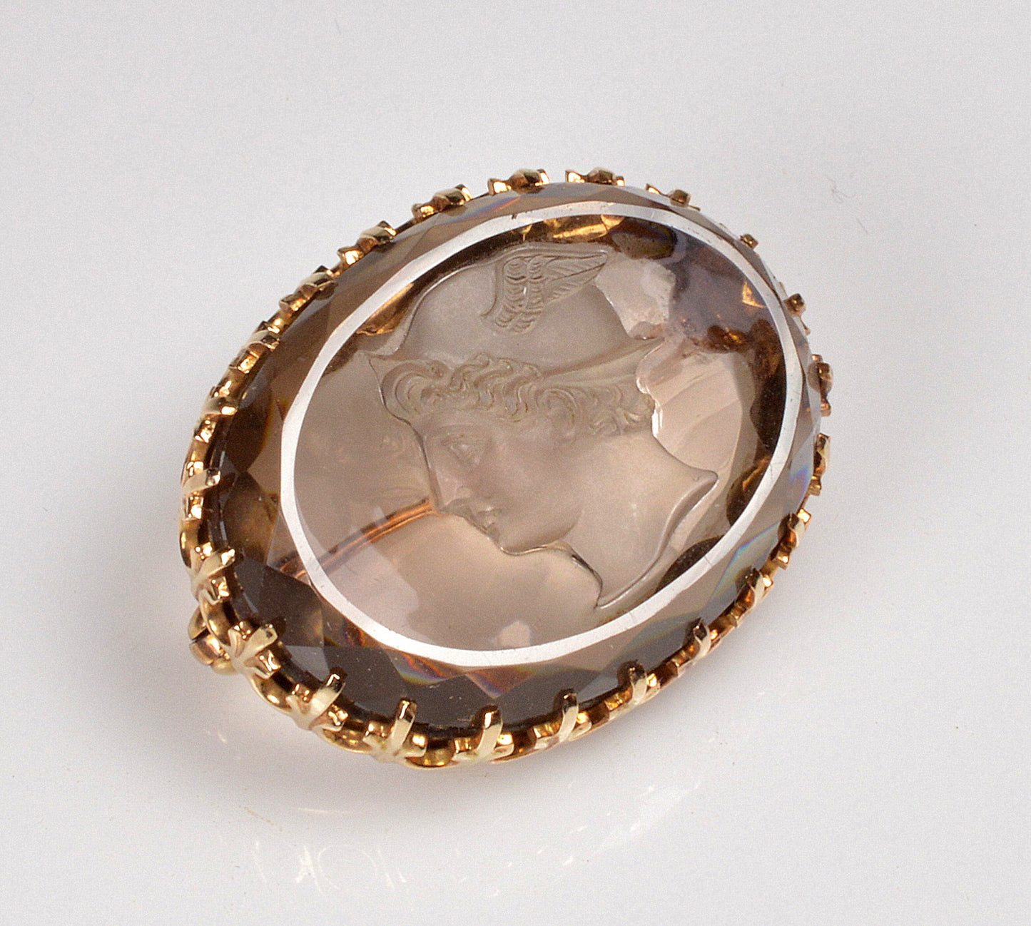 Masterfully hand carved smoky quartz Hermes intaglio cameo 10K gold brooch pin C.1900.