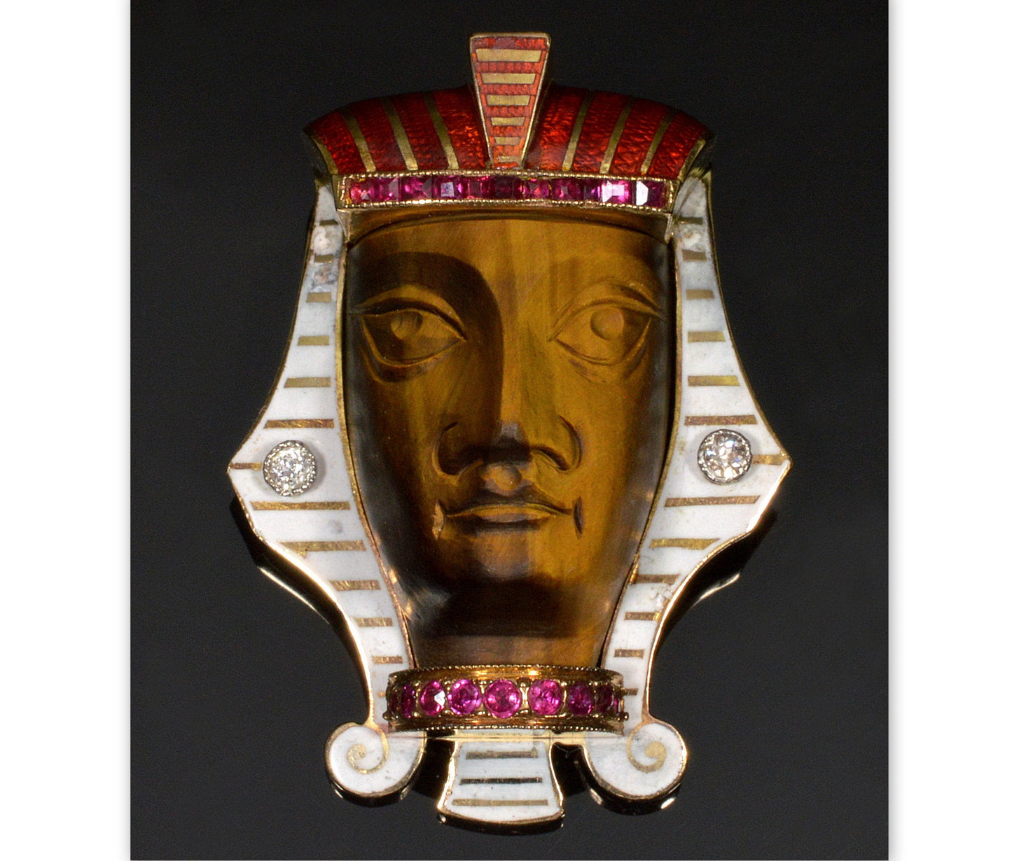Art Nouveau Egyptian revival carved tiger's eye Pharaoh head brooch