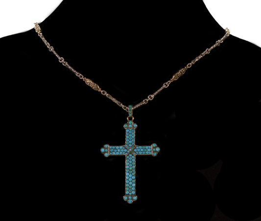 Antique Victorian 9K Gold Turquoise Cross Pendant C.1880 Pave Turquoise Carved Roses