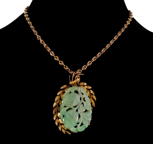 Art Deco 14K Gold Carved Jadeite Jade Large Pendant C.1920