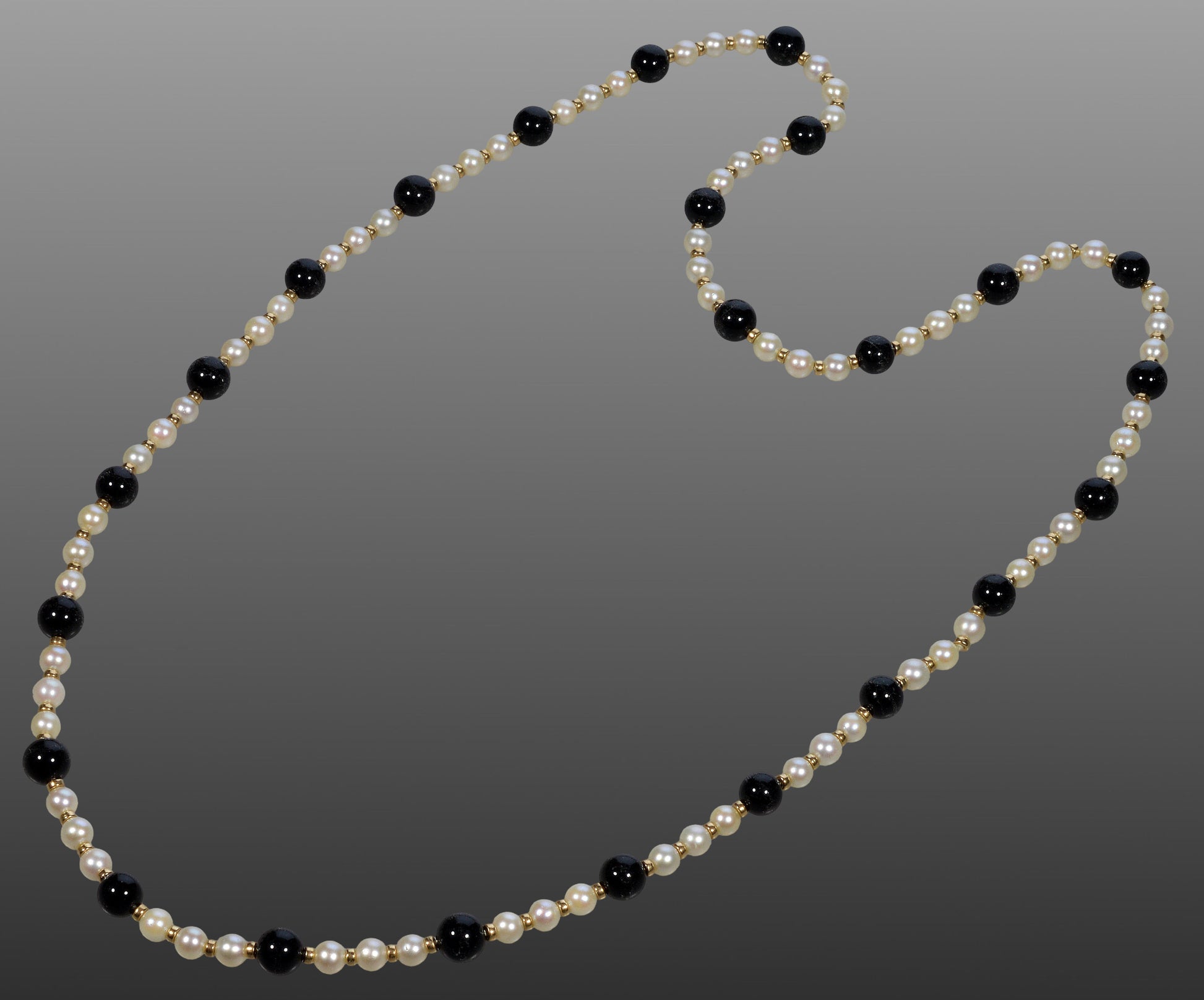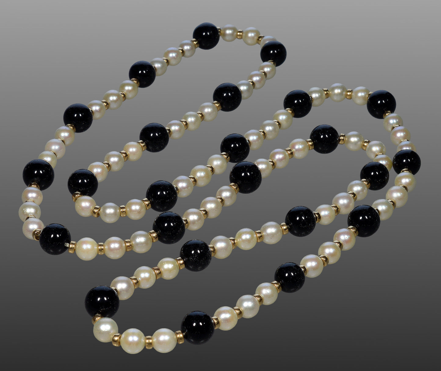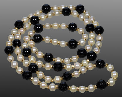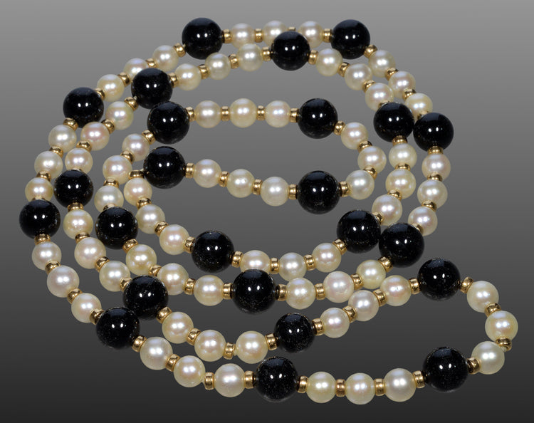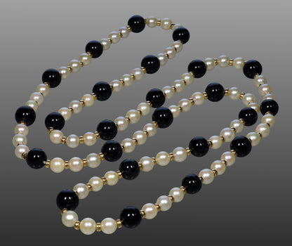 Dressy 14K Gold Pearl Onyx Necklace C.1950