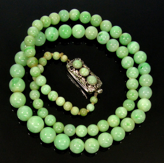 Antique Art Deco Jadeite Jade Bead Necklace 22 1/2", Sterling Clasp C.1920