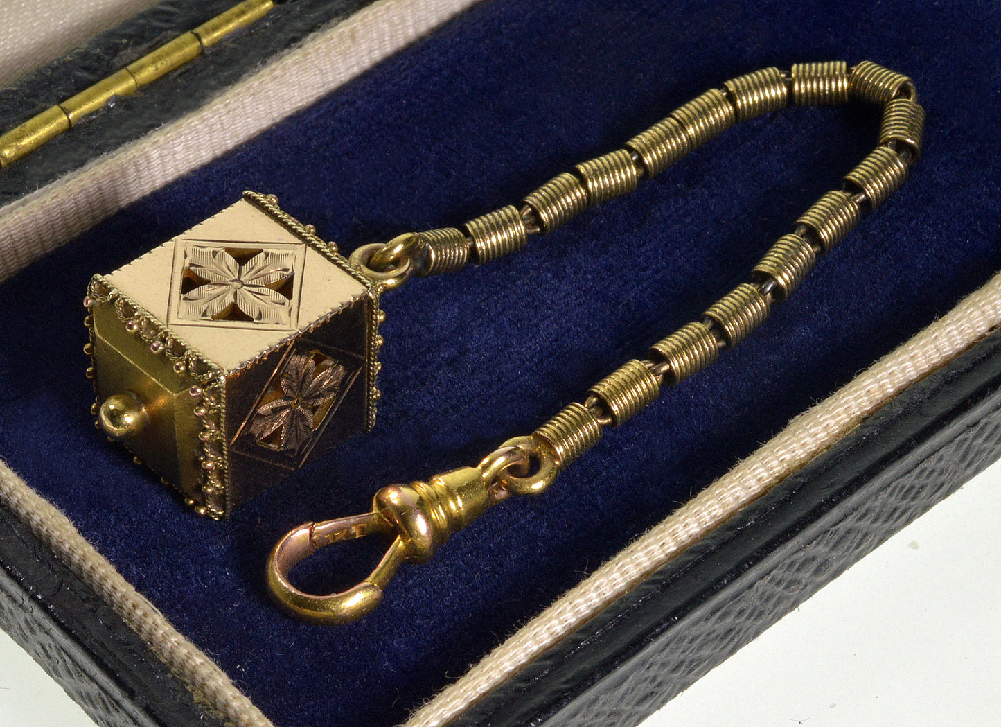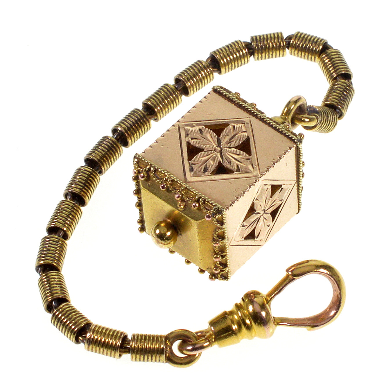 Gorgeous Victorian 14K gold Etruscan revival fob on fancy chain