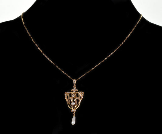 Antique Edwardian 14K Gold Diamond Pearl Pendant C.1900