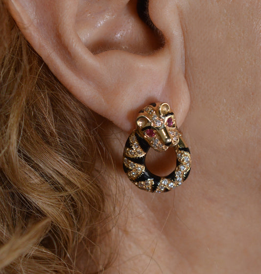Tiger Earrings 14K Gold Diamond Ruby Enamel C.1960
