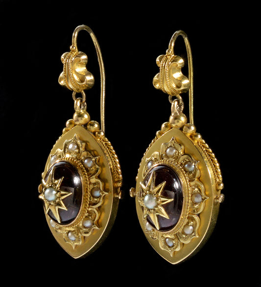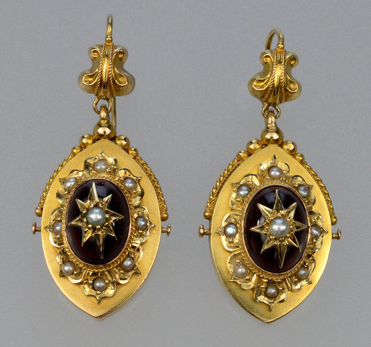 Antique Victorian 14K Gold Garnet Pearl Starburst Dangle Earrings C.1860