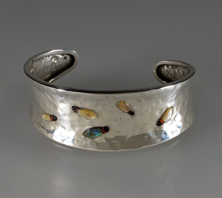 Antique Japanese Shibayama Insect Sterling Cuff Bracelet C.1900