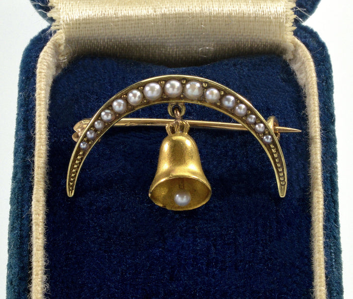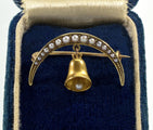 Antique Victorian 14K Gold Pearl Pin Brooch Crescent Moon Bell Chime C.1890