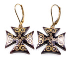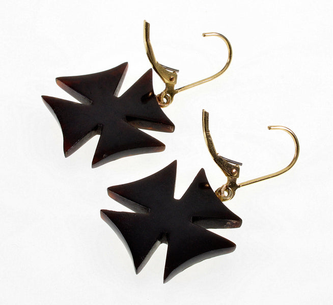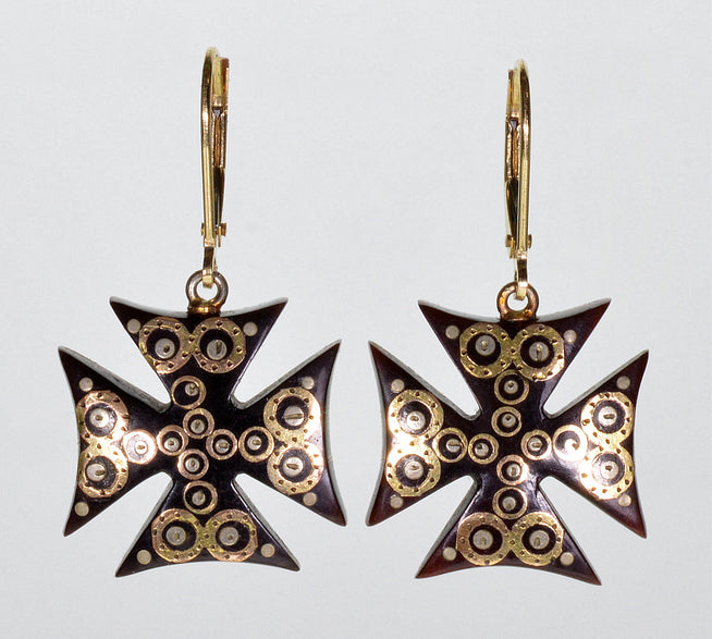 Antique Victorian Pique Inlay 14K Gold Maltese Cross Earrings C.1860
