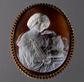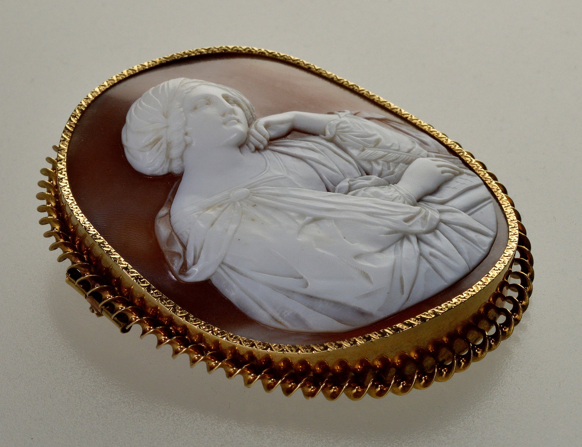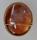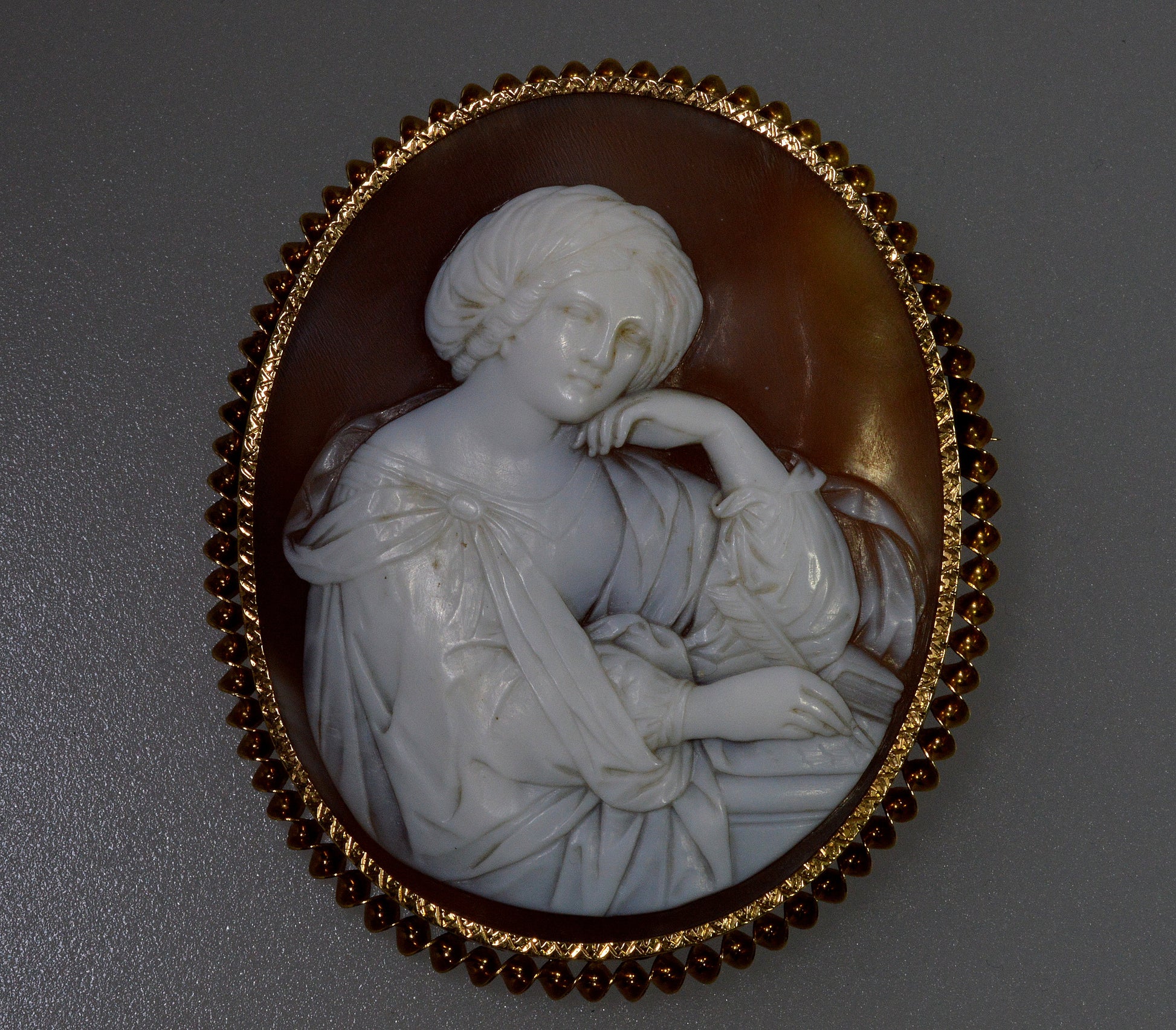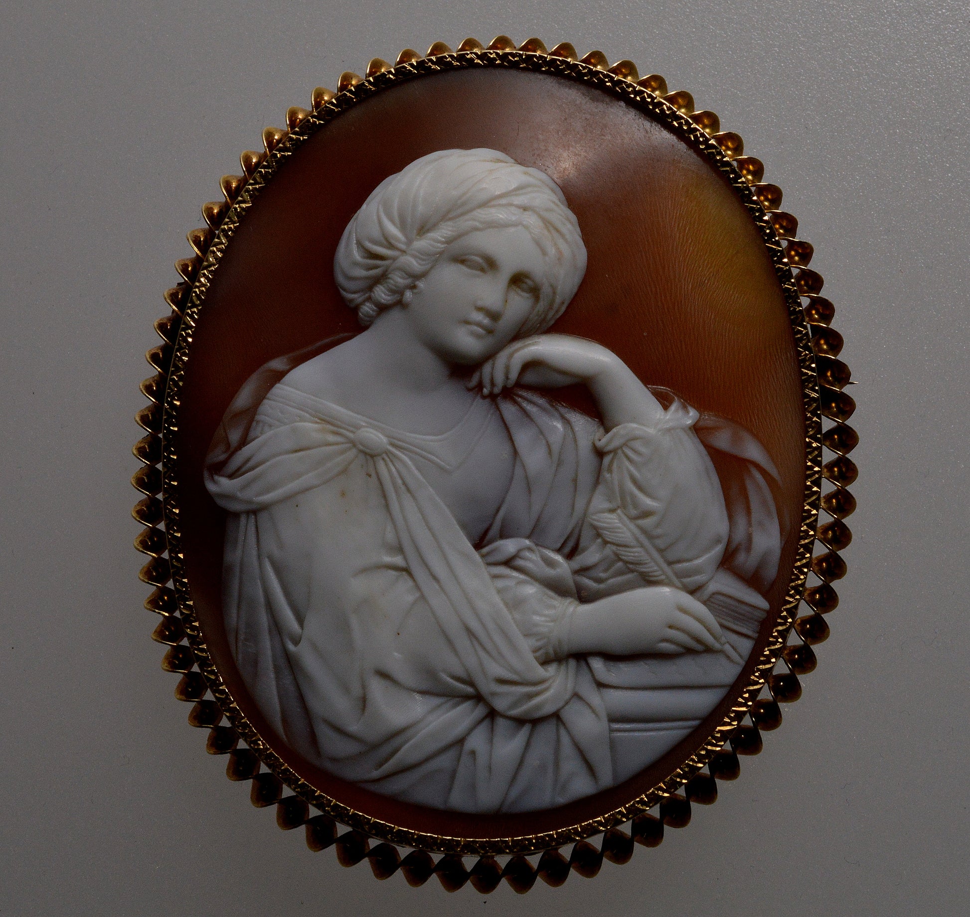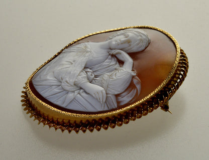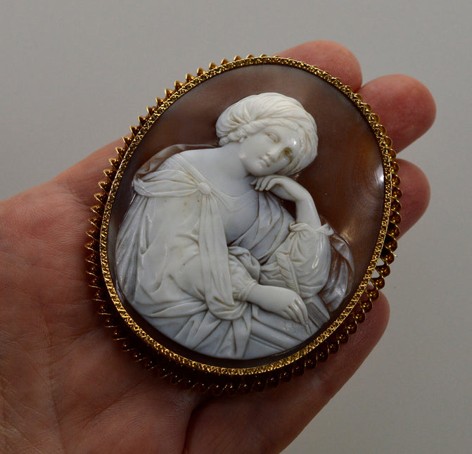 Antique Victorian Sibilla Persica Cameo Brooch 18K Gold Carnelian Shell C.1850