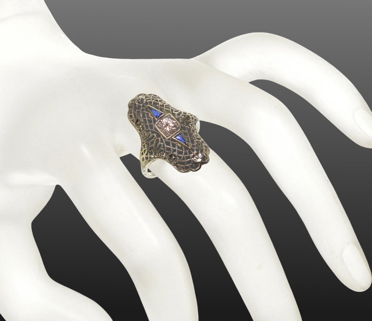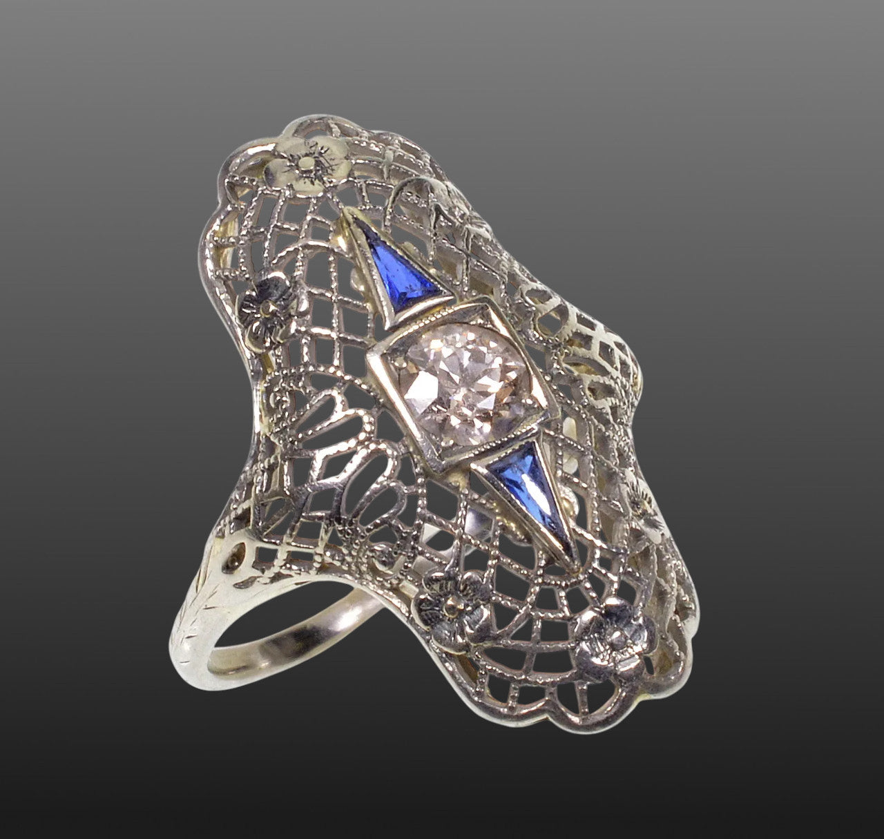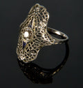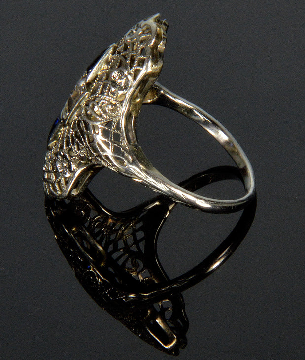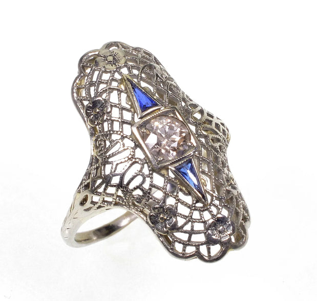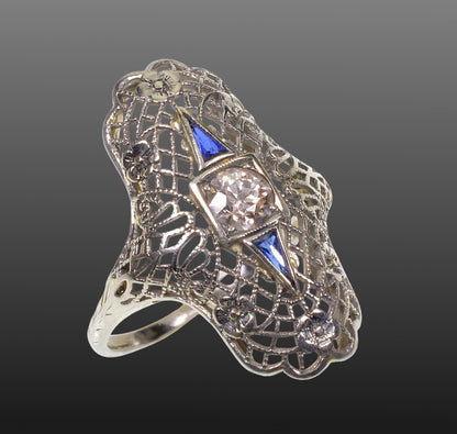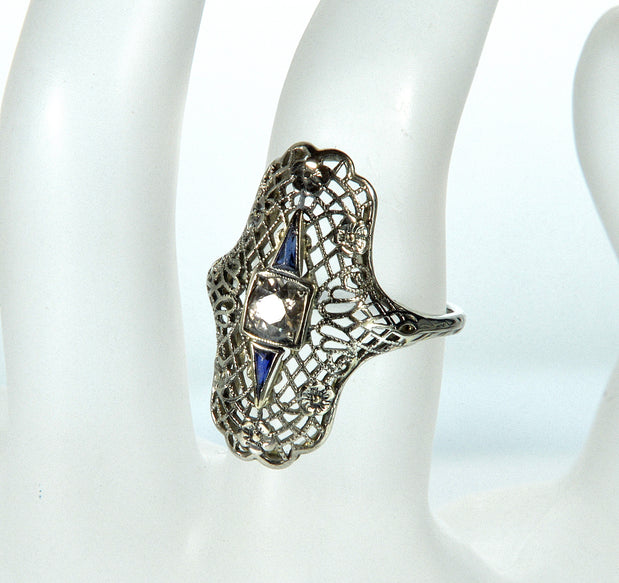 Art Deco 18K White Gold Diamond Sapphire Ring Size 5 3/4