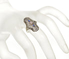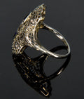 Amazingly crafted filigree top gracefully transitioning into the engraved band.