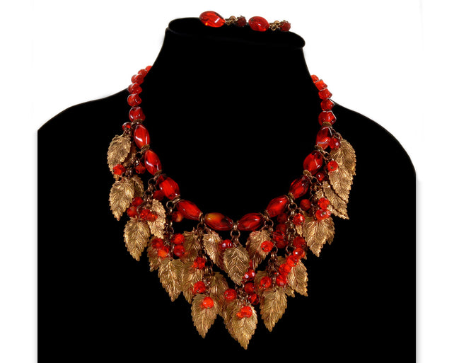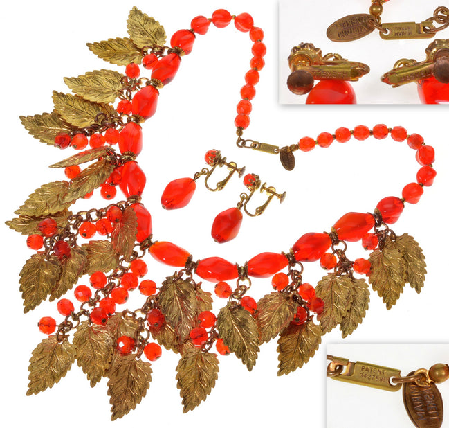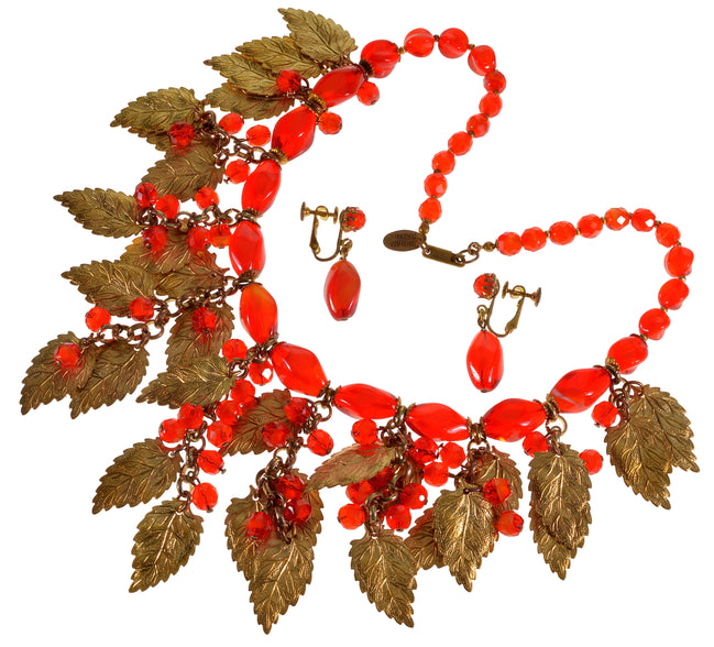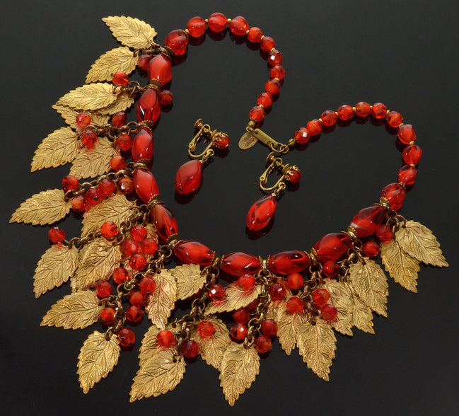 Miriam Haskell Lipstick Red Glass Brass Leaves Necklace Earrings Set Signed C.1970