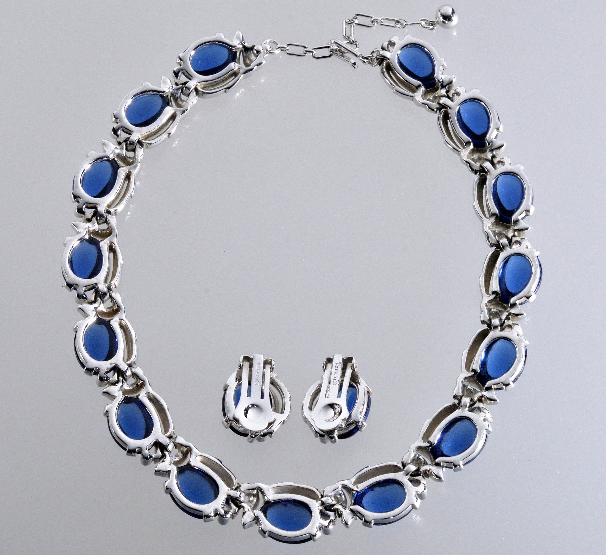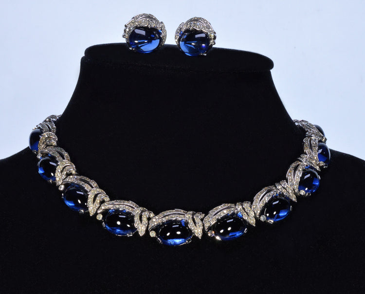 Trifari Philippe Book Piece Sapphire Glass Diamante Necklace Earrings Set C.1950