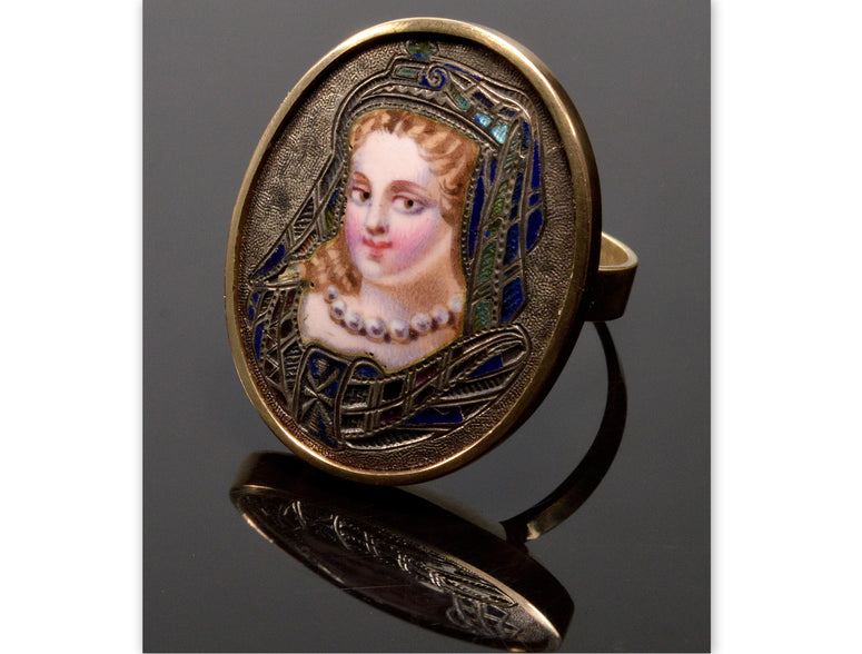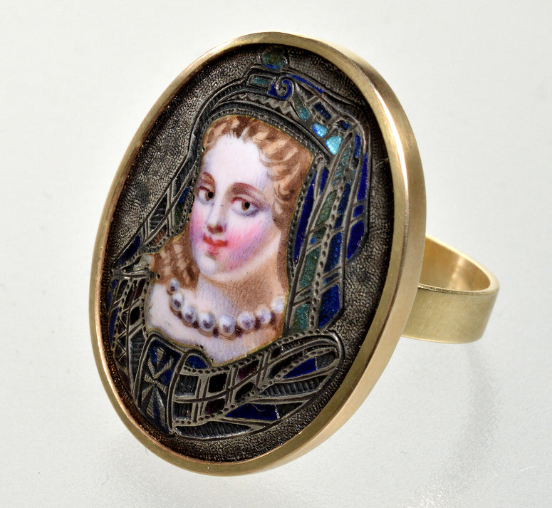Victorian 14K Gold French Champleve Enamel Ring C.1860 Cameo Portrait of A Princess