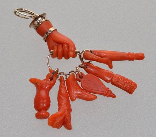 Antique Georgian 9K Gold Coral Hand Fist Charms Pendant C.1820