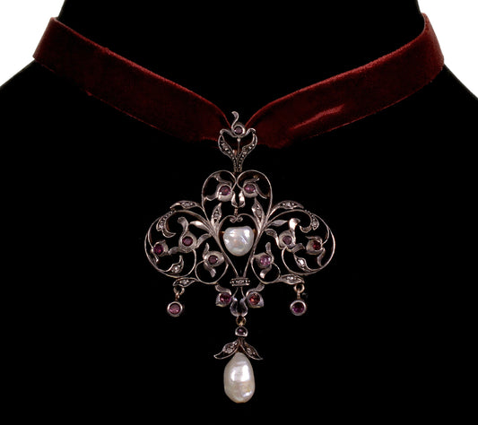 Antique Georgian Pendant 9K Gold Silver Diamond Pearl Garnet C.1790