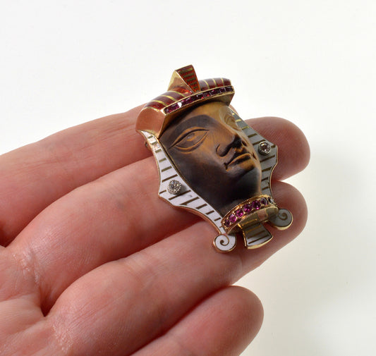 Antique Egyptian Revival 14K Gold Pharaoh Brooch Enamel Diamond Ruby Tiger's Eye C.1900