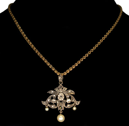 Antique Belle Epoque 14K Gold Silver Diamond Pearl Pendant Brooch C.1890