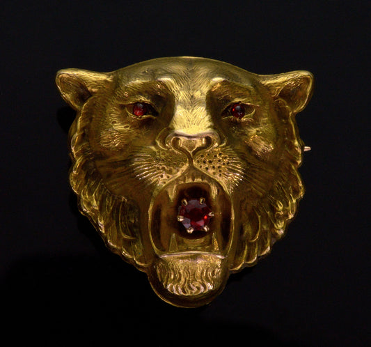 Antique Art Nouveau 10K Gold Ruby Lion's Head Brooch Pin C.1900