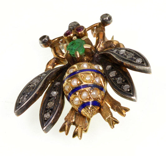 Antique Victorian 14K Gold Bee Brooch Diamond Emerald Pearl Ruby Enamel C.1890