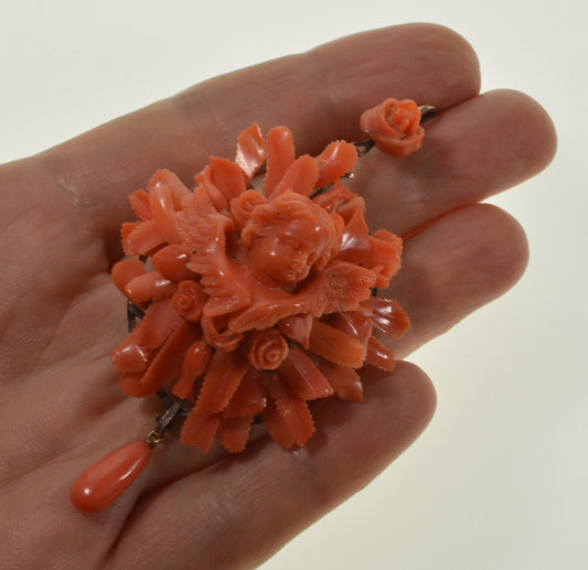Antique Victorian 9K Gold Salmon Coral Cherub Putty Angel Pendant C.1860