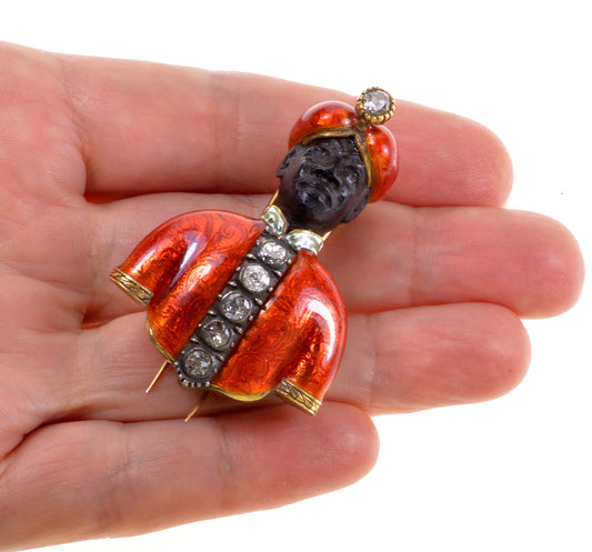 Victorian Italian Blackamoor Brooch Dress Clip 18K Gold 1.9 CTW Diamond Enamel C.1870