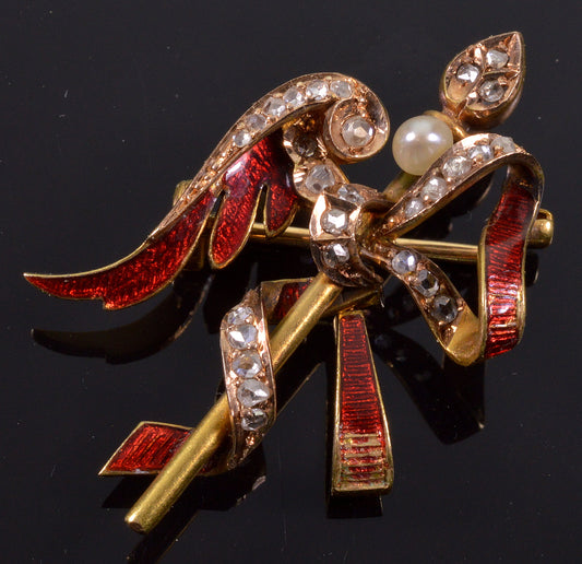 Antique Georgian Angel Wing Arrow Enamel 18K Gold Diamonds Brooch Pin C.1820
