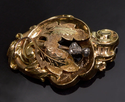 Antique Victorian 14K Gold Diamond Acanthus Brooch Pin C.1860