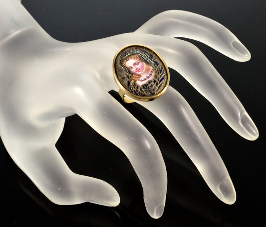 Victorian 14K Gold French Champleve Enamel Ring C.1860 Cameo Portrait of A Princess