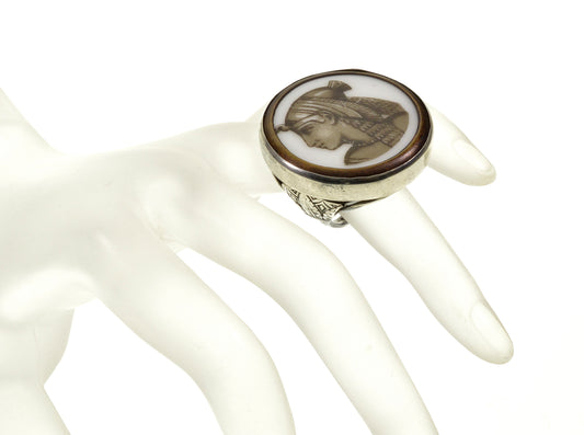 Antique French Art & Crafts Egyptian Revival Sterling Ring Cleopatra Sepia Enamel Cameo Size 7 C.1870